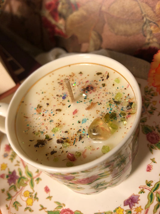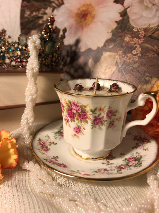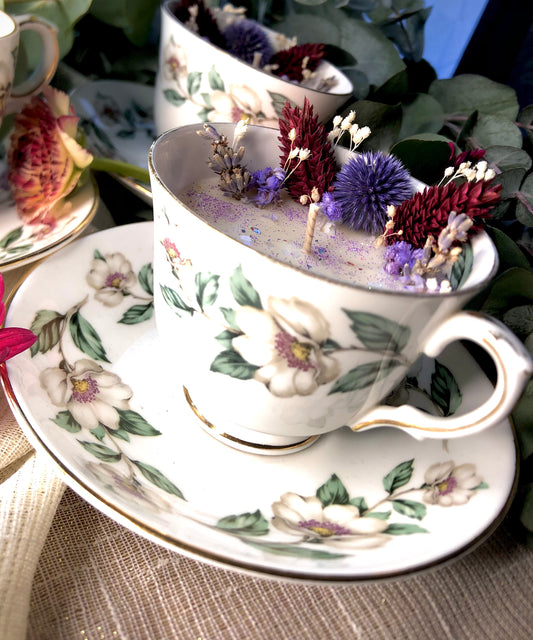 Bougie coulée dans des tasses en porcelaine chinées. Une touche vintage, romantique et...