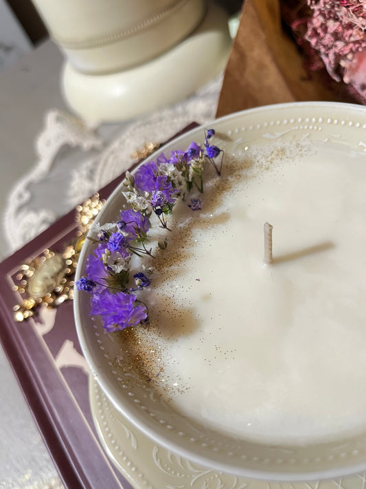 De plus, pour ajouter une touche de délicatesse et de beauté, nous décorons nos bougies avec des fleurs séchées et des cristaux. Les fleurs apportent une touche de romantisme à votre intérieur.